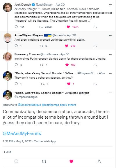 I'm not sure, either, what they meant by all these years of bellowing about the common man taking up arms and fighting against the invader or the oppressor when, now that so much of the population of Ukraine is doing exactly that (and succeeding admirably, against all odds!) These Fucking People (and not a few far-left "Tankies" as well) have stood up on the side of the Invader and the Oppressor and are mad because the Ukrainians are
